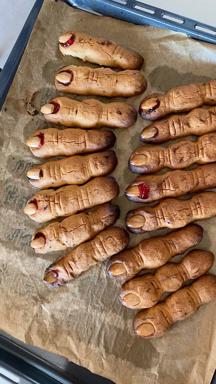 Готуємо тісто. Візьми глибоку миску та з’єднай всі сухі інгрідієнти: борошно, цукор, ванілін та розпушувач. Додай м’яке вершкове масло або маргарин та воду. Заміси м’яке та еластичне тісто. Розділяємо його на невеличкі шматочки і формуємо з них пальці, трохи надаючи їм вигнуту форму для реалістичності. Кінчик пальця вдавлюємо і викладаємо мигдаль, який буде уявним нігтем. Візьми деко, застели пергаментом і виклади наші вироби випікатись у раніше розігріту духовку до 180°C. Готуємо 15-20, хв, до набуття золотавого відтінку. Дай печиву охолонути і можна приступити до декорування. Обережно нанеси джем на кінчики пальців, щоб створити ефект «крові».