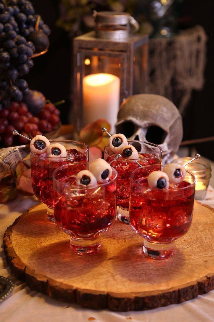 Візьми велику посудину та з’єднай журавлиний/вишневий, апельсиновий сік (обов’язково обирай сік яскраво насиченого кольору) з газованою водою чи лимонадом. Додай лід (бажано у формі черепів або інших символічних фігур), щоб додати ефекту нашого напою. На завершення прикрась пунш желейними черв’ячками, які плаватимуть у чаші, надаючи напою моторошний вигляд.