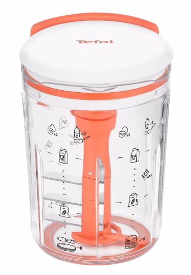 Достоинства Tefal K1844404. Среди ключевых преимуществ следует отметить сочетание сразу нескольких функций в одном решении. Измельчитель практически заменяет миску для смешивания, венчик и мерный стакан, потому кухонный процесс становится более организованным. Механический принцип работы освобождает от подключения к электросети. Пользователь не ограничен расположением розетки и может готовить в любой части кухни. Для получения однородной массы достаточно нескольких движений. Эргономичная форма делает измельчитель удобным в руке, а разборная конструкция позволяет быстро промыть все детали.